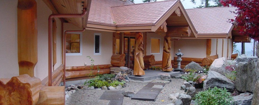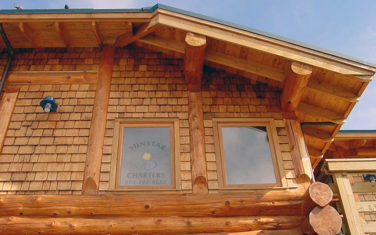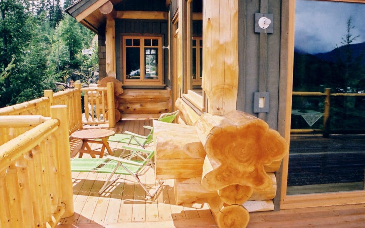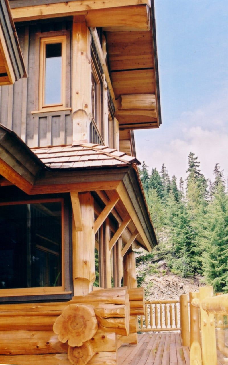“Fusion style” takes it name from the fusion of post and beam techniques with traditional full scribe techniques. Three to four courses of scribed logs are used at the base of a wall with posts and beams above. This allows a home to feature the notched corner details of a traditional log home without having to deal with some of the negative consequences related to shrinkage and settling of log walls.